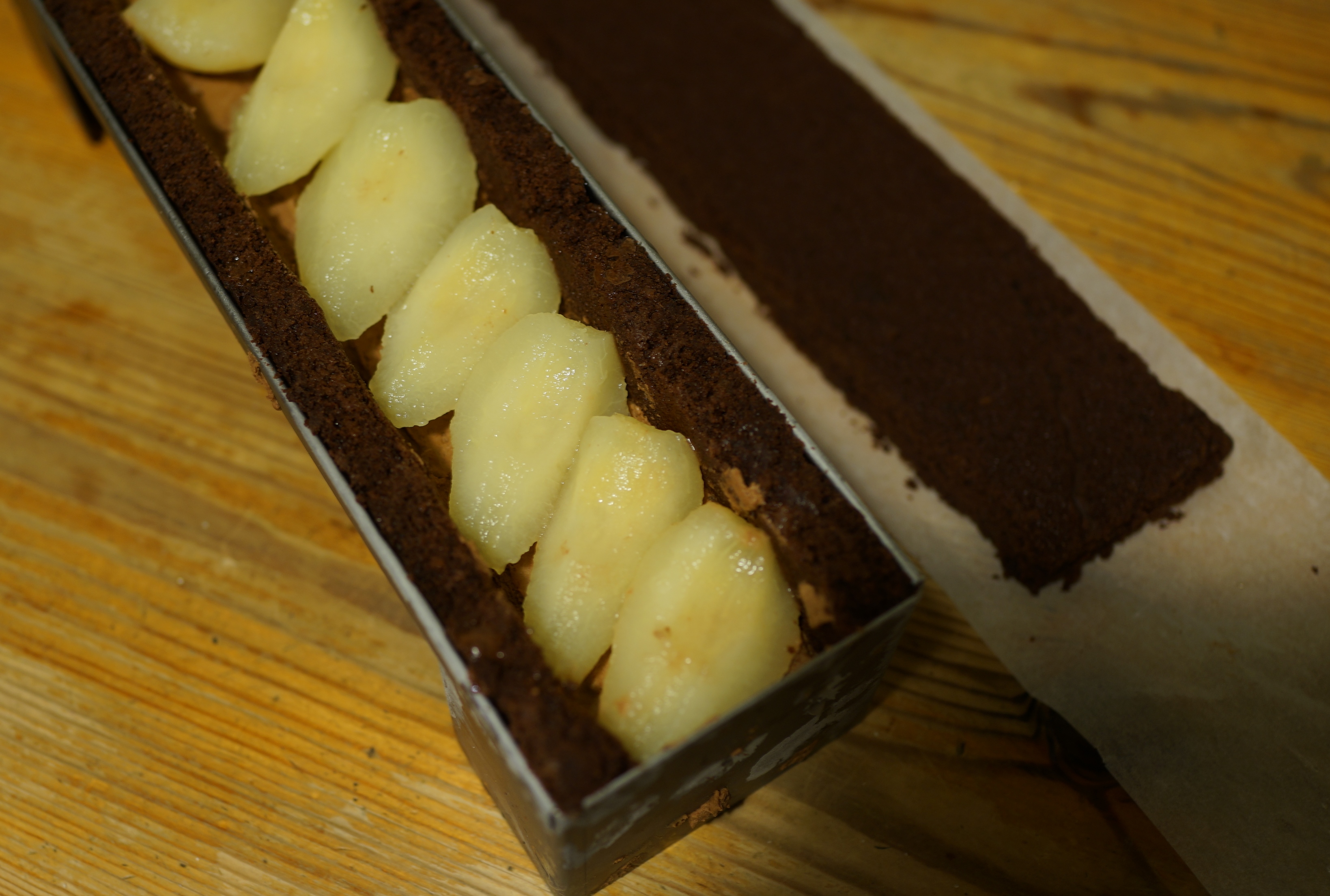 What issues, you ask yourself? Well, the sponge this time was soooo moist that it would not go into the gouttière mould without cracking and breaking up. Which didn’t happen the first time I made it – that’s baking for you. The good news is that the cake still works if you put it all together like a jigsaw puzzle and plug holes with bits of sponge. The experience can be a little traumatic if you don’t know this. I was still a bit shaky when I started the chocolate mousse filling and had to make a dry caramel, which we all know is fraught with danger. Then there were issues trying to fit everything in the log, so am seriously thinking of eliminating an element for my next prototype. Hmmm…how to put the pear cream and another layer of mousse on top, and then cover it with the sponge rectangle… impossible mon ami?