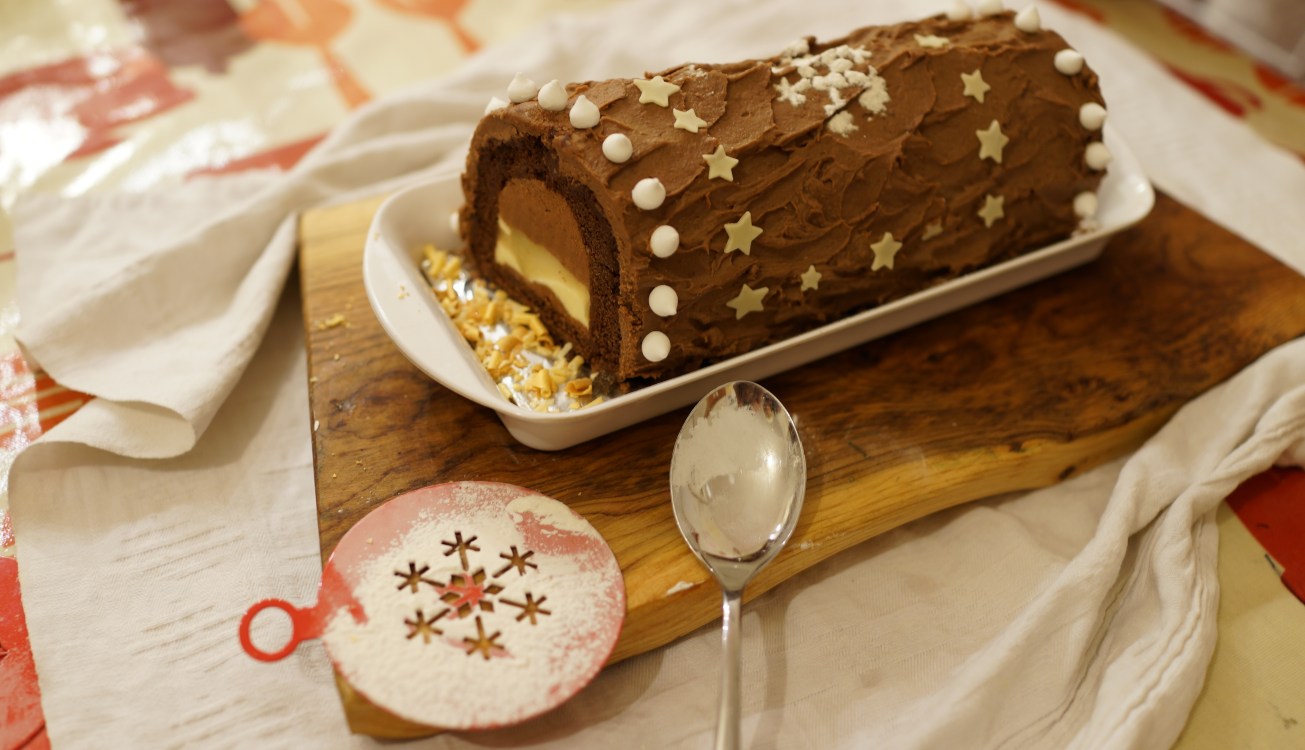 Finally, I took the frozen log out of the freezer and discovered there was no functioning blowtorch to heat up the sides of the goutièrre mould and allow the log to loosen up enough to come out. Hmm … a hot towel? dipping it quickly in hot water? When it eventually emerged from the mould it was not a very pretty sight, but luckily it soon got completely covered in spiced ganache 🙂