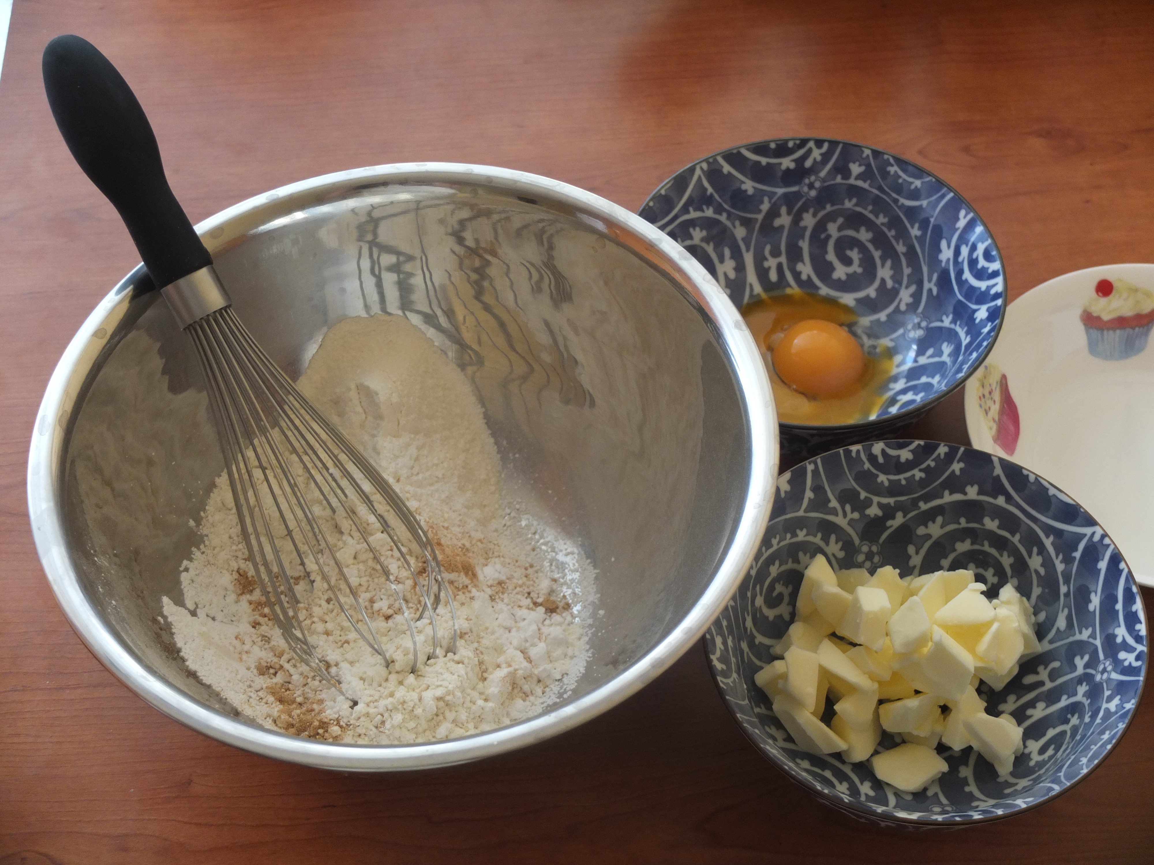- Add the small cubes of cold butter and rub into the dry ingredients with the tips of your fingers until you get a bowl of what looks like dry and not totally fine breadcrumbs (see the video on making shortcrust pastry).