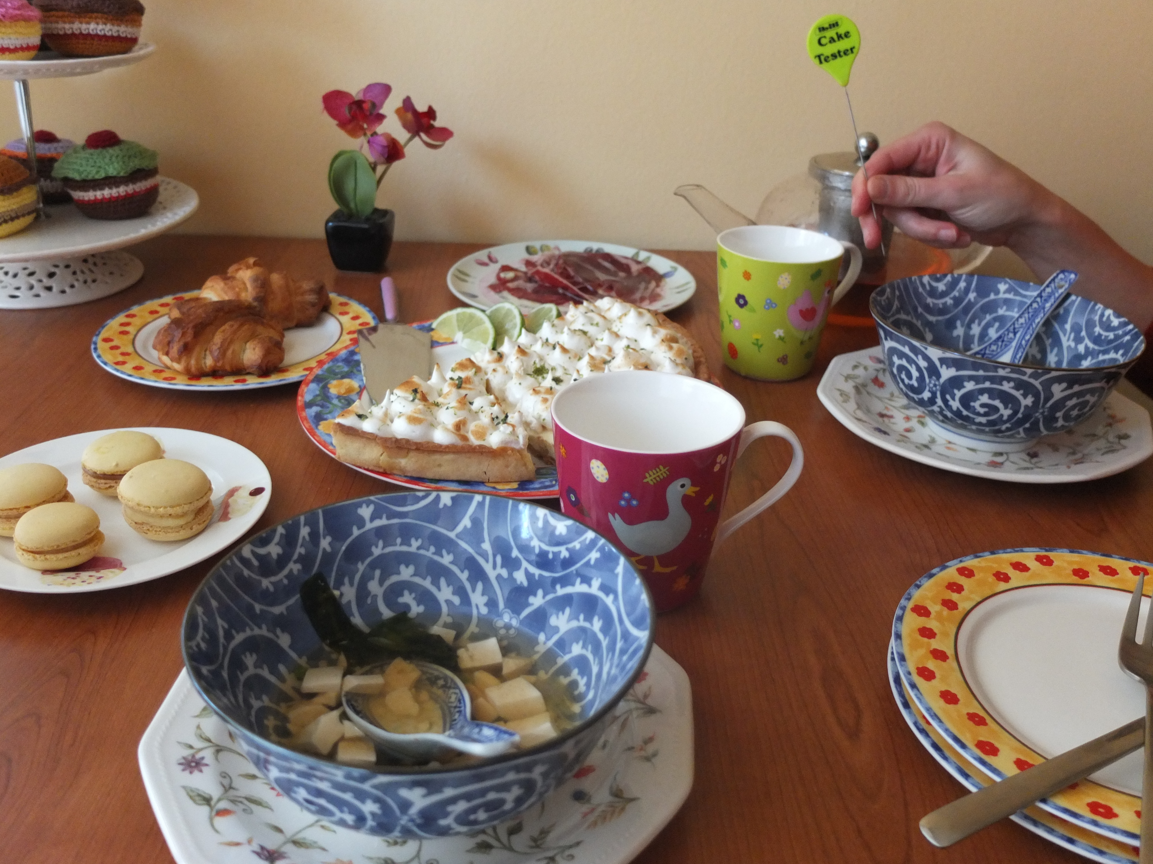 I wanted to take full advantage of this new tester, who apparently loves their food, for our cake dinner (yes, cake dinner). The full works I thought: hmm, lime pie, lemon macarons and croissants too maybe? Would that be enough, I wondered. Scroll down to see the result: tables laden with sweet edibles but with a surprise healthy starter and a little present for me – hmm, what could that be?