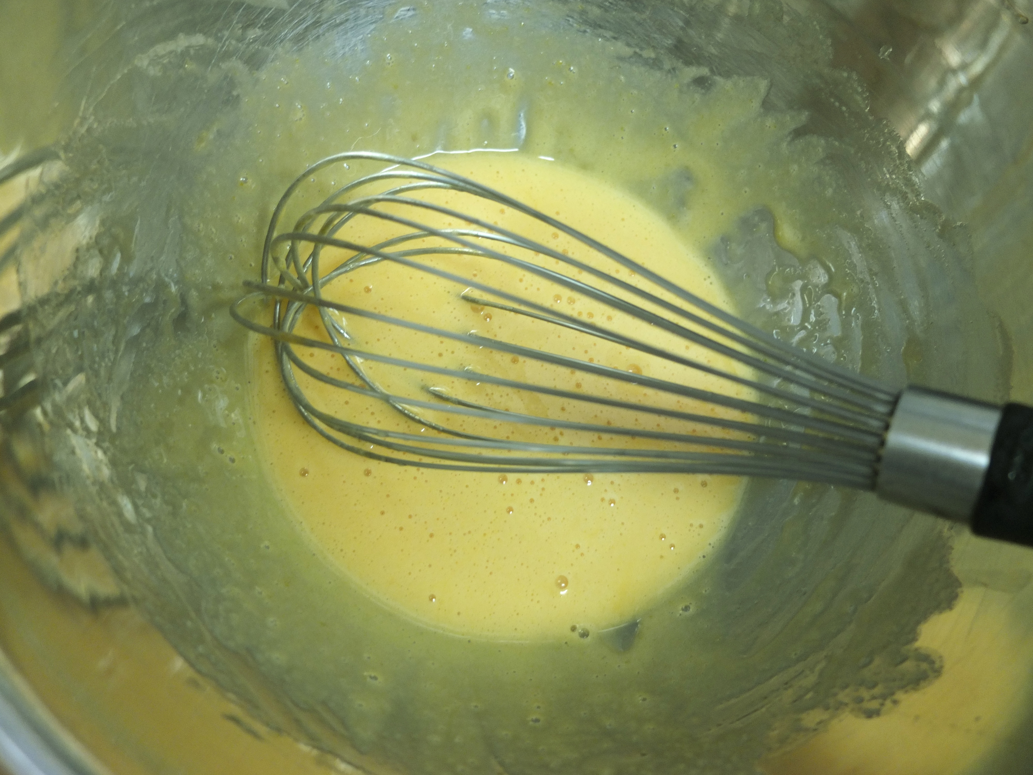 Pour the flour in a thin steady stream into the mixture, while gently folding. Fold until just incorporated. Do not overmix or the mixture will flatten out and you’ll get sponge bricks…!