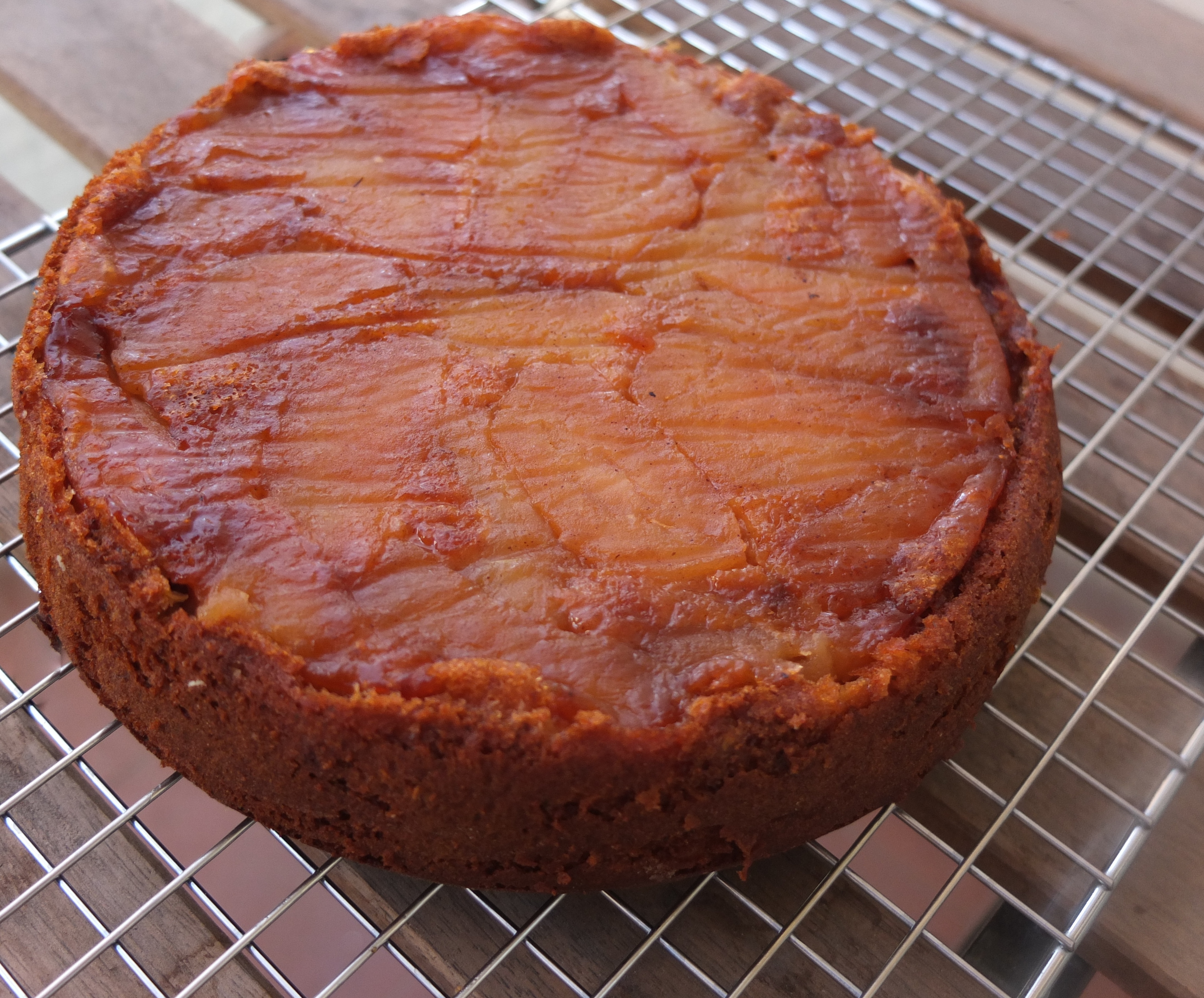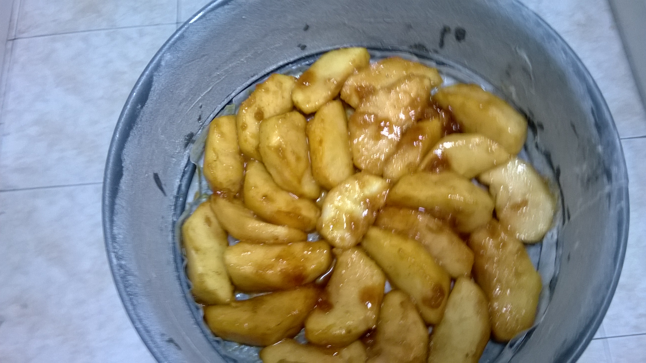 - Immediately pour the batter gently over the apples at the bottom of the cake tin.