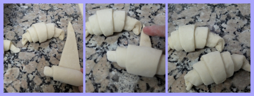- Pull to stretch out each triangle a little then roll the large side away from you towards the point (which you wet with a little water). Make sure the point is under the croissant.