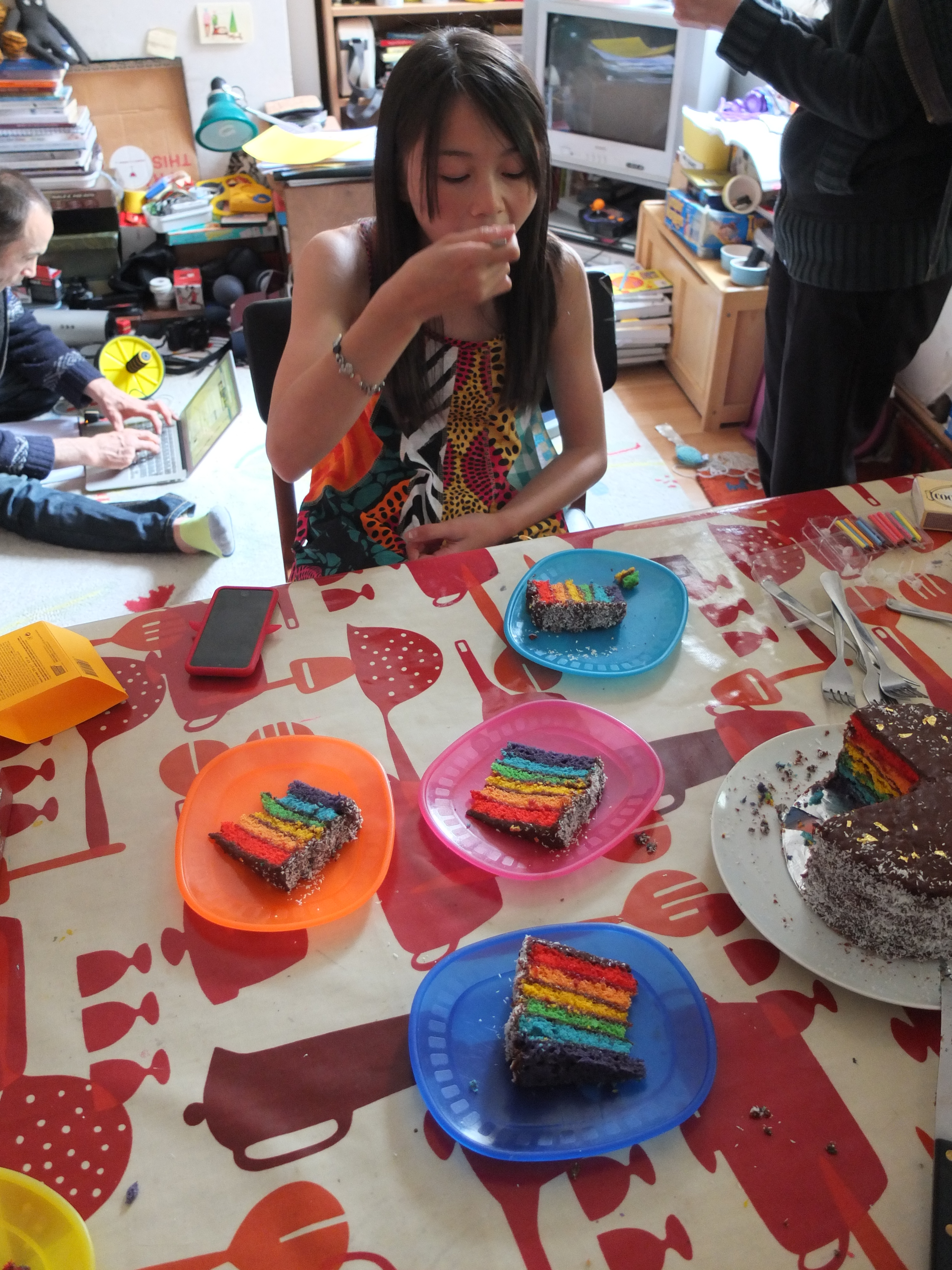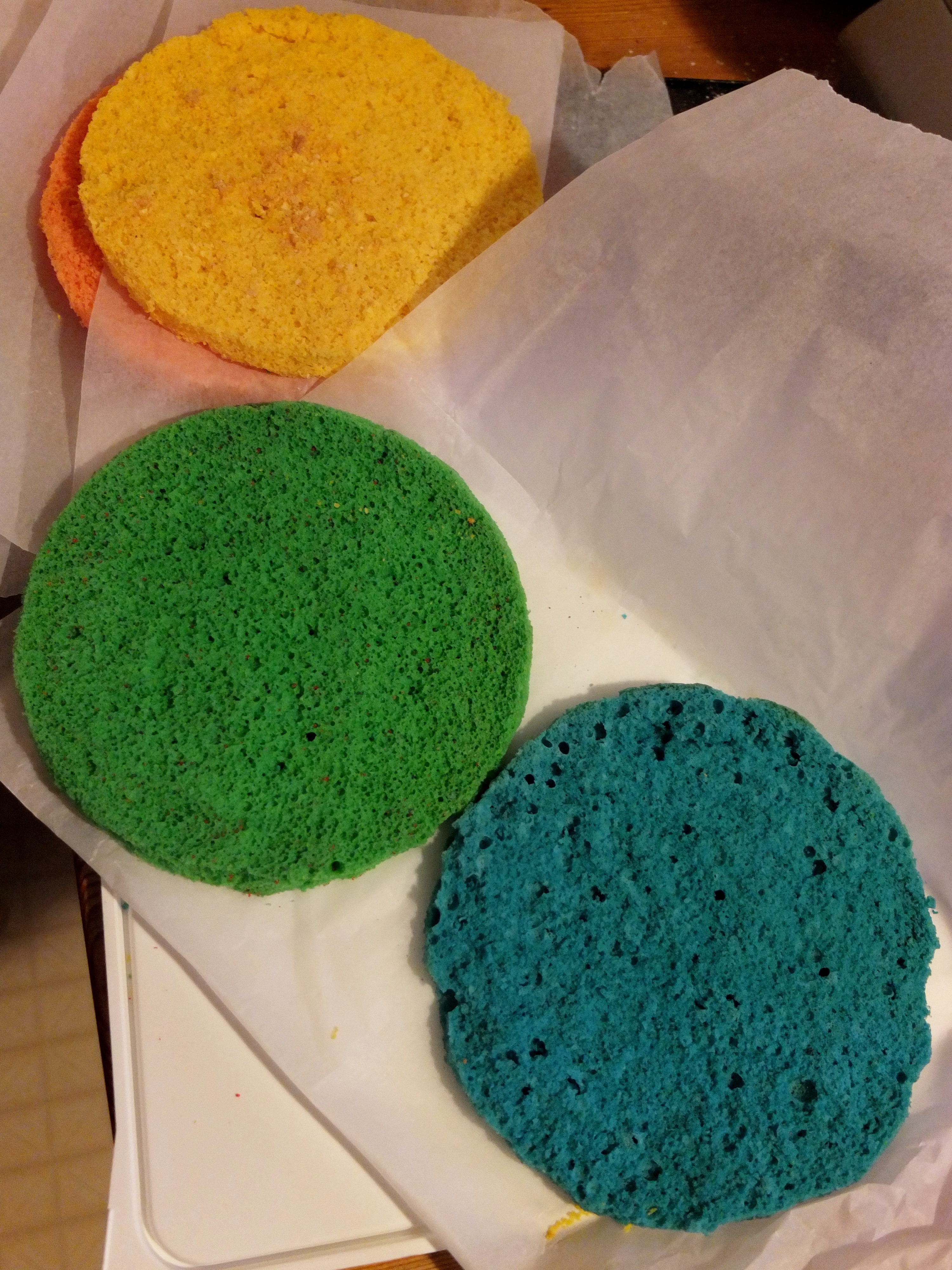LayeringYou can do the layering I did this time, … Rainbow cake layers 1…  or an alternative with less jam and more chocolate icing:rainbow cake layers 2Here are the real-life groovy layers: