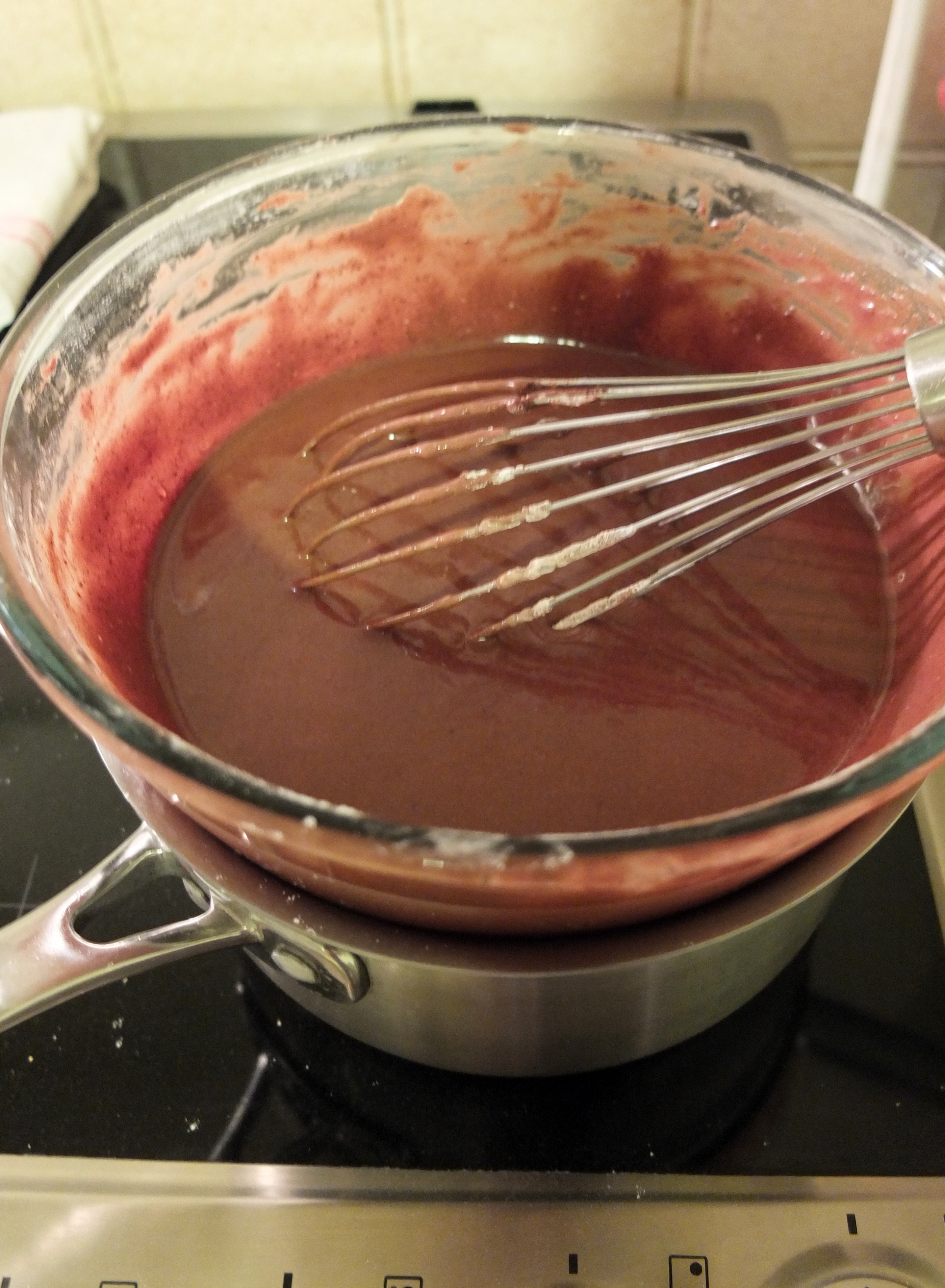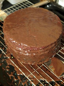Make the chocolate icing by sifting the icing sugar and cocoa into a heatproof bowl.  Whisk in the melted butter and 180g/1 cup of the milk.  Add more to thin the icing if necessary.  Taste to check if you need more sugar or cocoa (to taste).  Whisk over a bain marie (a little water that’s simmering gently on a low heat) – the water should not touch the bowl.  You want an icing that’s liquid enough to cover a cake with a thin layer but not too runny or thin.Place your bottom layer on the foil or gold circle and place on a wire rack over a large baking or oven tray.