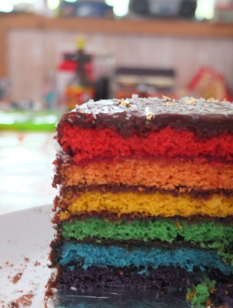 A colourful, magical rainbow in a cake.  Who could resist?  Okay, maybe people like my brother who have strong feelings about E numbers in food.  I did try using natural food colouring, I really did.  But that plan failed and I’ll explain why later.  Wait, don’t leave yet!  This is actually a butterless sponge made with cornflour and so a gluten-free cake filled with alternating layers of raspberry jam and cocoa icing, which also covers the cake.  Finished off with a fine coating of dessicated coconut.  It’s a stunning cake I’d been wanting to make for ages.  So with my niece’s and nephew’s birthdays coming up I thought ‘Hurray!  Rainbow cake!’  🙂  Rainbow cake!Though others may have made it before, the original ‘famous’ rainbow cake was reportedly invented in 2009 by Kaitlin Flannery of the Whisk Kid blog.  She says she created it for a friend because the outside is iced and looks completely normal but once you cut into it you realise the cake is COMPLETELY CRAZY, like her friend! 🙂