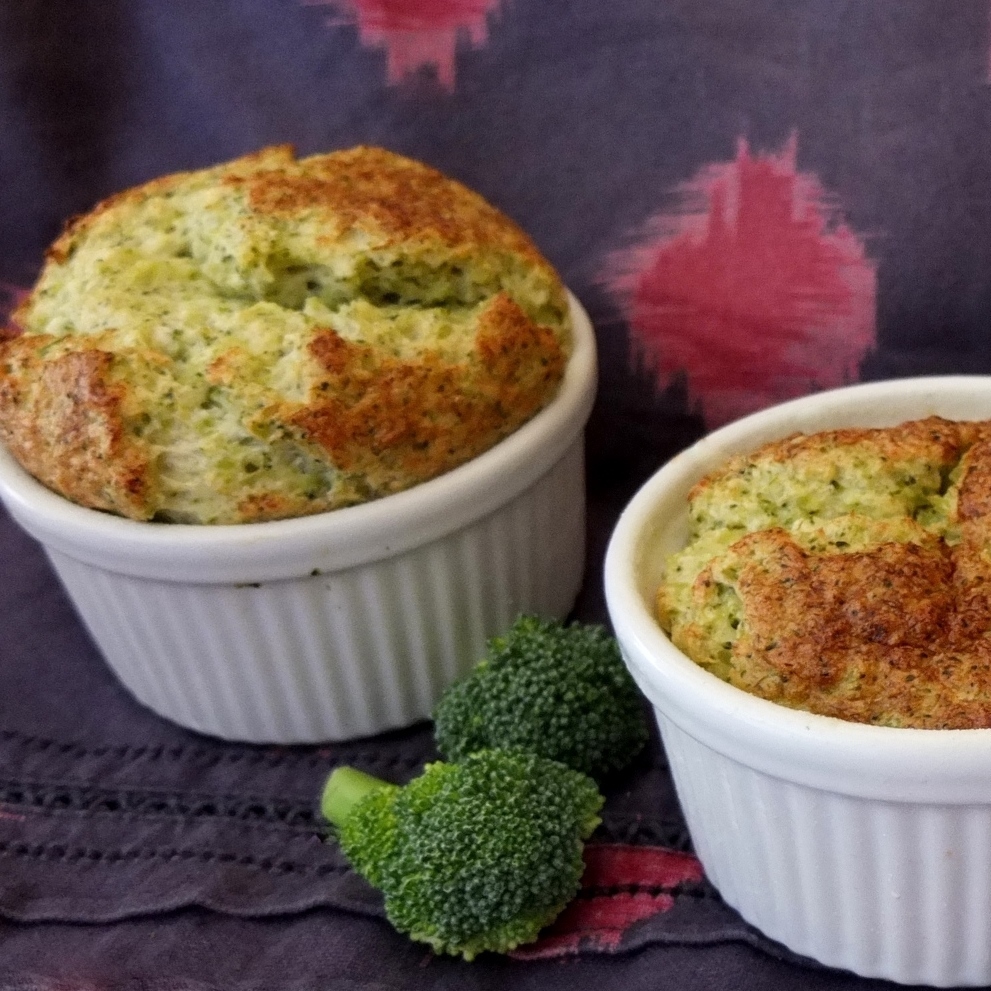 For a challenge… or more of a party really. Especially since everyone at our gathering has agreed soufflés are easier than expected! You can see all the delightful puffy creations at Our challenge soufflés little party. Here’s my contribution: gluten-free broccoli and cheese soufflés that are delicious, good for you, easy, fluffy and cheesy! Even if you don’t adore broccoli you’ll appreciate the lovely flavours given a wonderful kick by a blend of nutmeg and cayenne pepper. And if you love broccoli like me you’ll be over the moon and back. Woosh and woohoo! 🙂