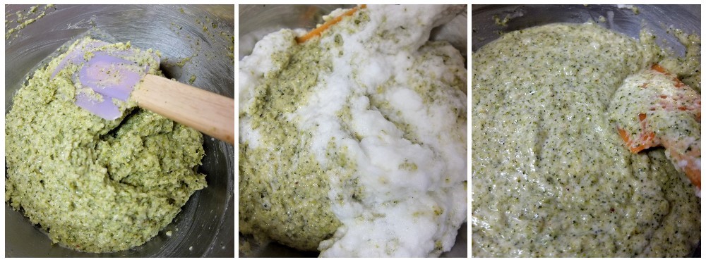 - With figure of eight motions, fold in a quarter to a third of the whites into the broccoli mixture to lighten it. Combine fairly well.
