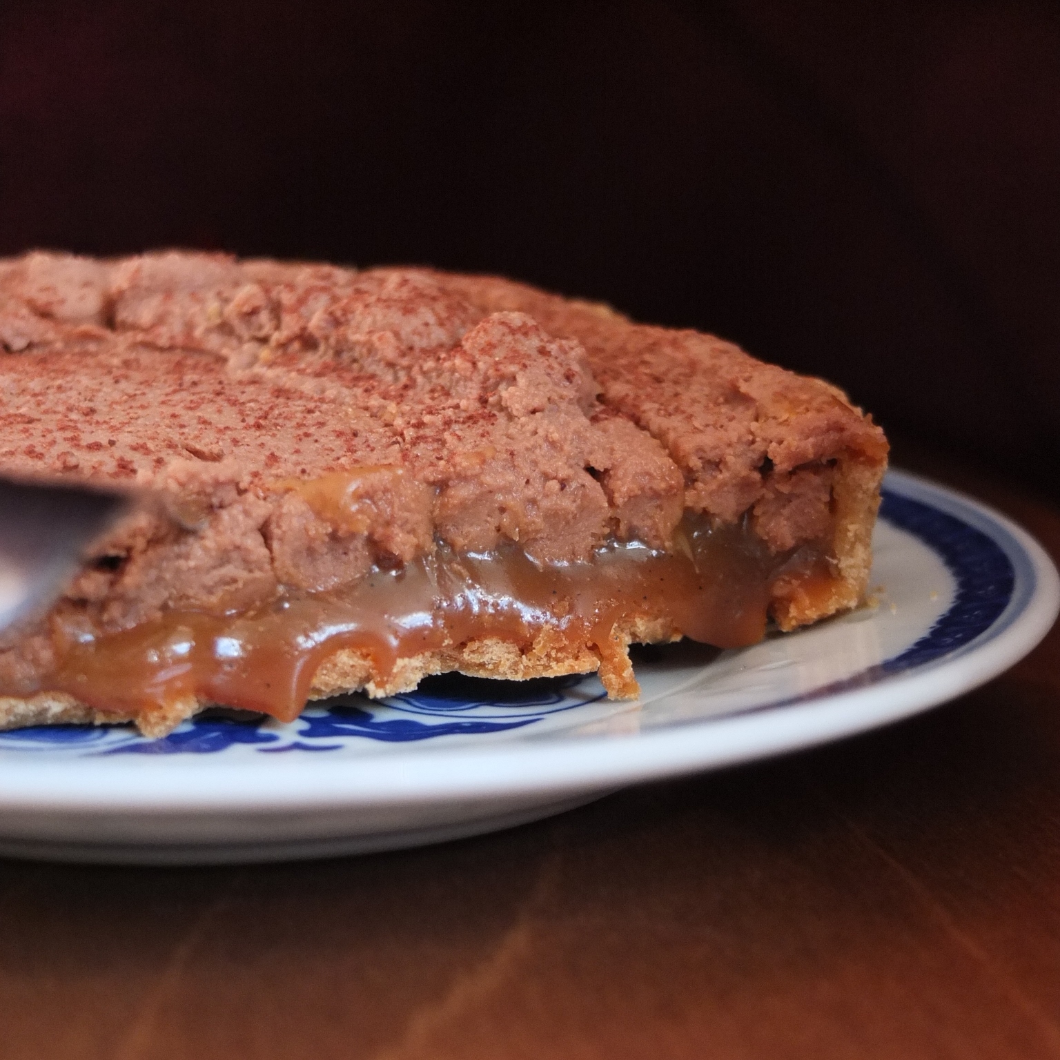 Spread the caramel on the base of the tart. Then pipe the chocolate mousse with a number 8 medium nozzle over the caramel in concentric circles. You can sprinkle a little cocoa powder over the tart through a sieve.