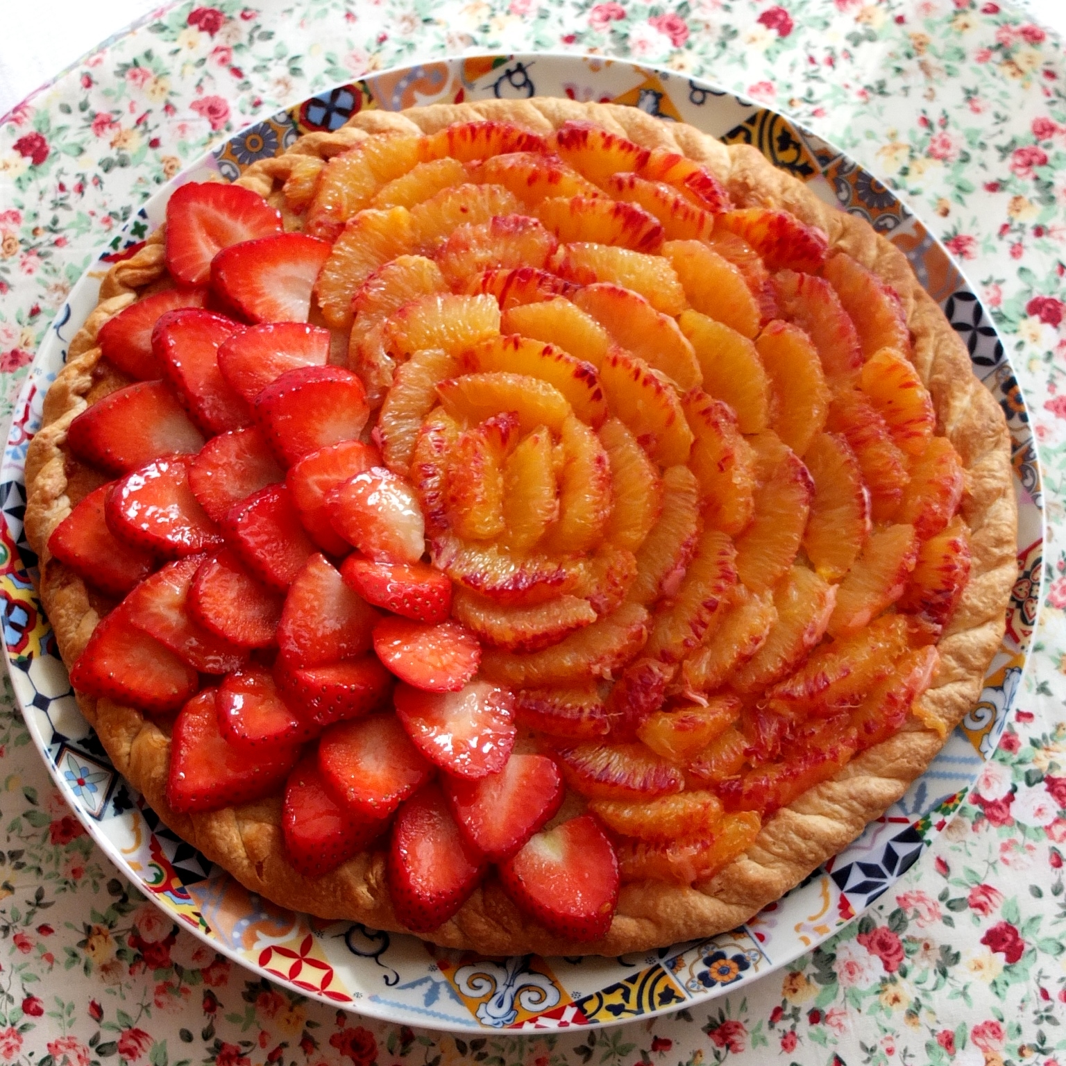 I used my homemade inverted puff pastry but you can buy some ready-made good quality all-butter puff.  If you buy the cheap normal puff pastry it really isn’t very nice and almost a waste of blood oranges.  I tried it – look here’s the tart.  Imagine some rather dry tasteless pastry.  Oh dear.  I couldn’t even face giving it to friends to try.  I also learnt you need a lot of blood oranges to cover a large tart.  I didn’t have enough so took out my back-up fruit – strawberries!Easy blood orange frangipane tart