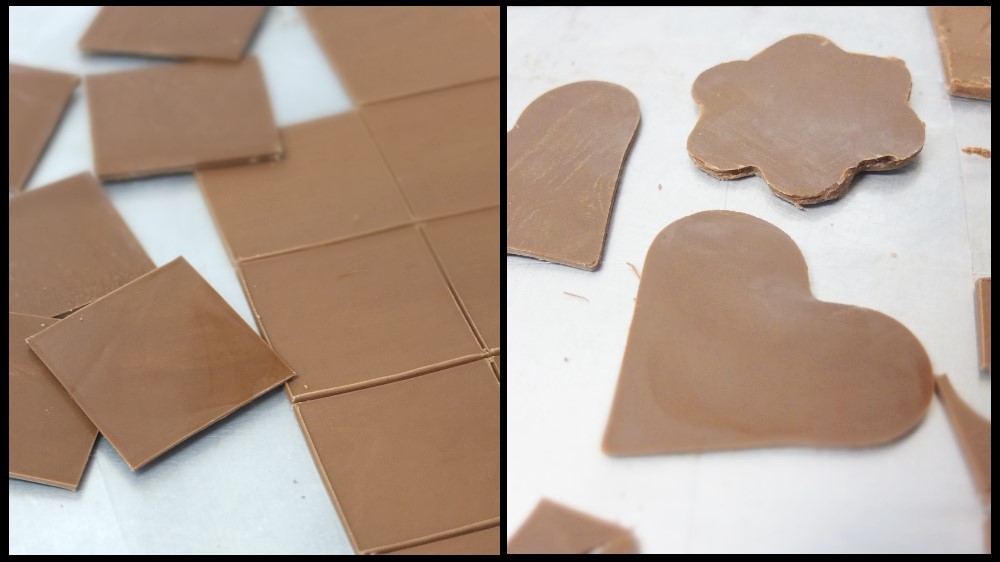 When your chocolate is tempered and at the correct temperature (28-29°C/82.5-84°F) use it immediately to make shapes. For instructions see my page on making thin decorative shapes with tempered chocolate.