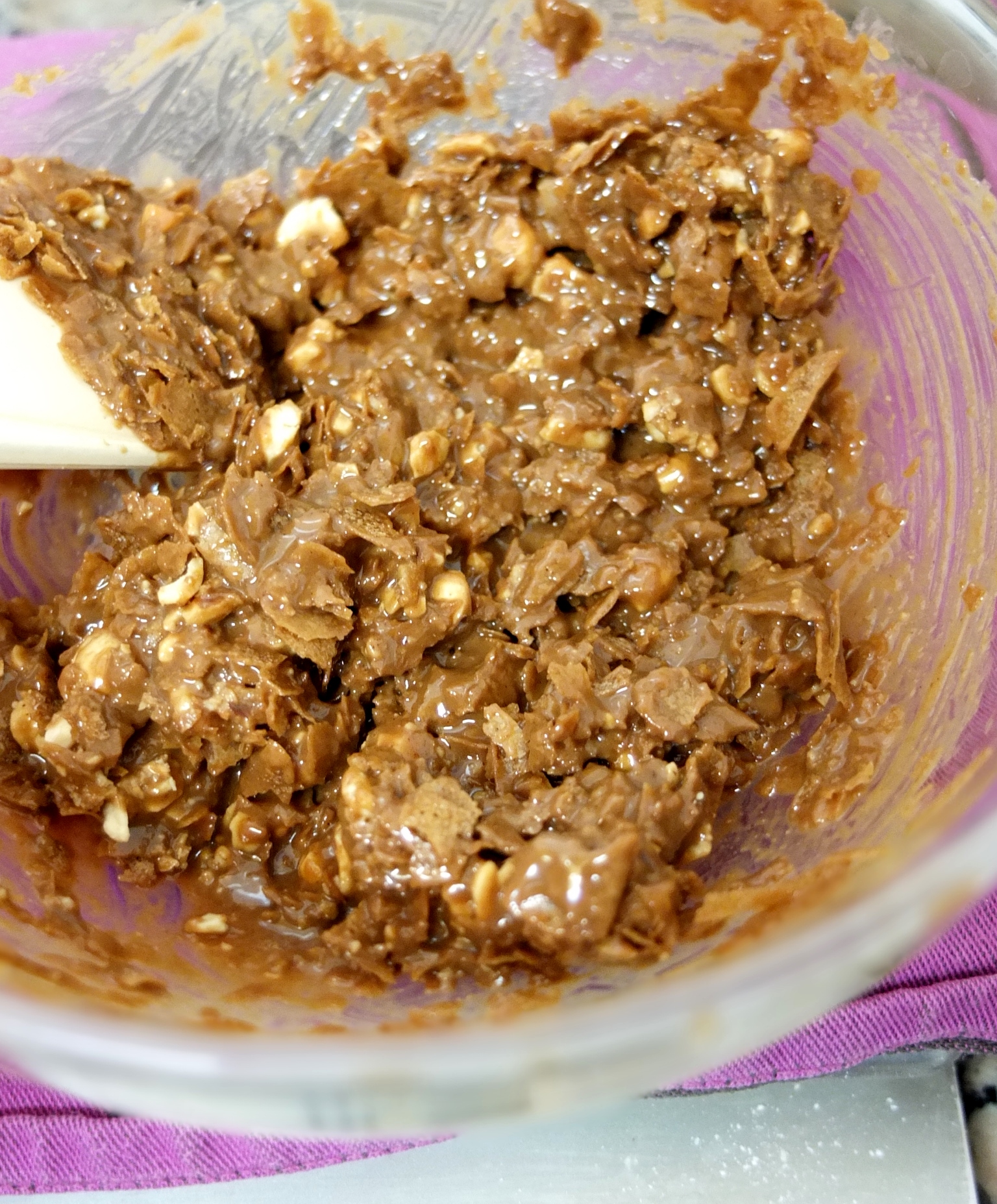 - Finally stir in the chopped hazelnuts and crushed Gavottes crêpes or other crispy wafer-like biscuits. Don’t stir too much, so you keep the crispy pieces more intact.