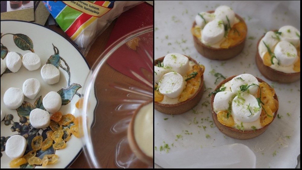 Making pastry and lining tart moulds: 20 minutes’ work. Blind baking: 10-20 minutes. Making filling: 5-10 minutes. Chilling: 1 hour. Marshmallow topping: 5-10 mins. Total amount of work: 30-40 mins.