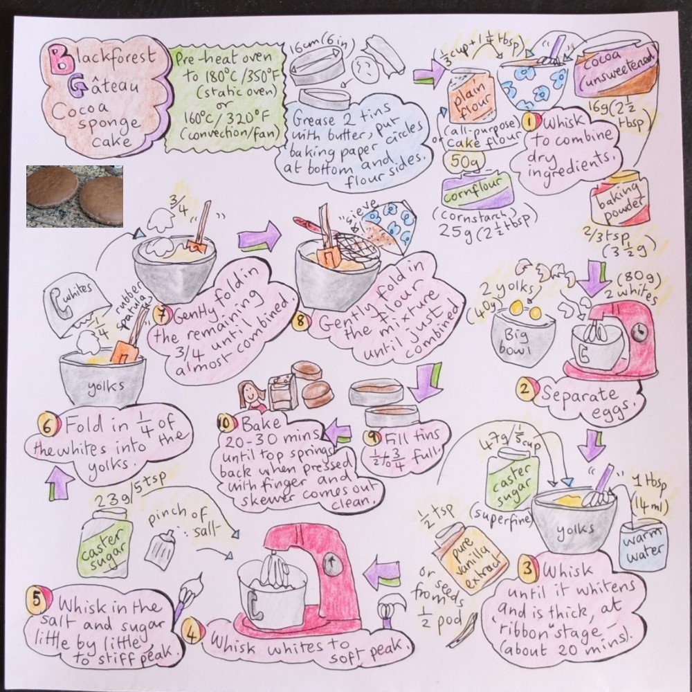 When a German friend says let’s make a Black Forest gâteau there’s only one possible answer: ‘Yes, please!’. So begins a voyage of discovery leading to a cake that’s less sweet, so delicious and perfect for a birthday party or a rainy day when the world’s gone mad. Following a combination of her grandmother’s and online recipes, my friend and I had a wonderful evening making this classic German layer cake that’s so beloved worldwide. I discovered bottled sour cherries that go in the bottom layer above the pastry base which provides a delightfully contrasting texture. And the light fatless cocoa sponge is soaked in kirsch syrup and layered with kirsch-flavoured whipped cream! Of course there has to be kirschwasser (kirsch cherry liqueur) and quite a lot, but you could replace it with the sour cherry juice. And if you’re worried about calories the good news is slices of this cake freeze perfectly. So I suggest you um… make this amazing Black Forest cake!!! 🙂