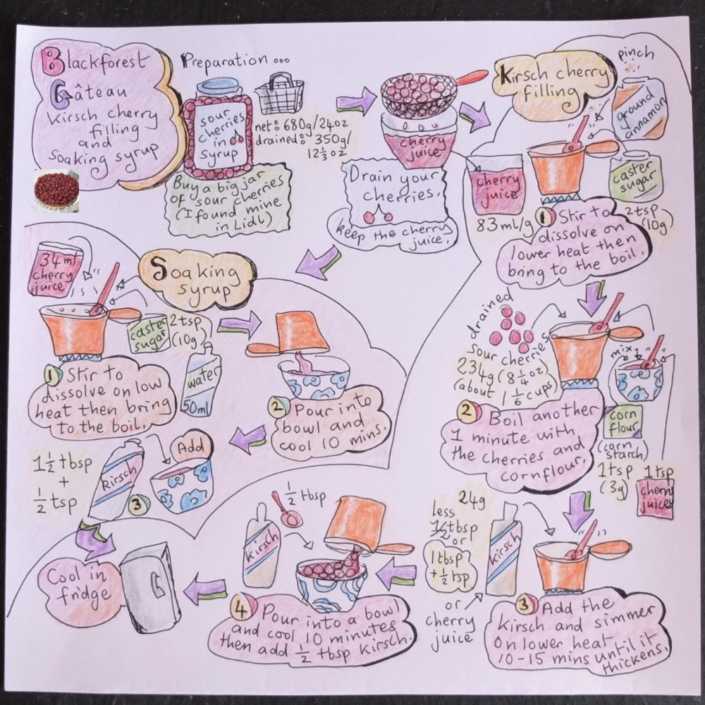 Kirsch cherry filling and soaking syrup – buy a big jar or can of sour cherries of about 680g/24oz (350g/12.3oz drained). Mine were in a light sugar syrup and from Lidl supermarket.
