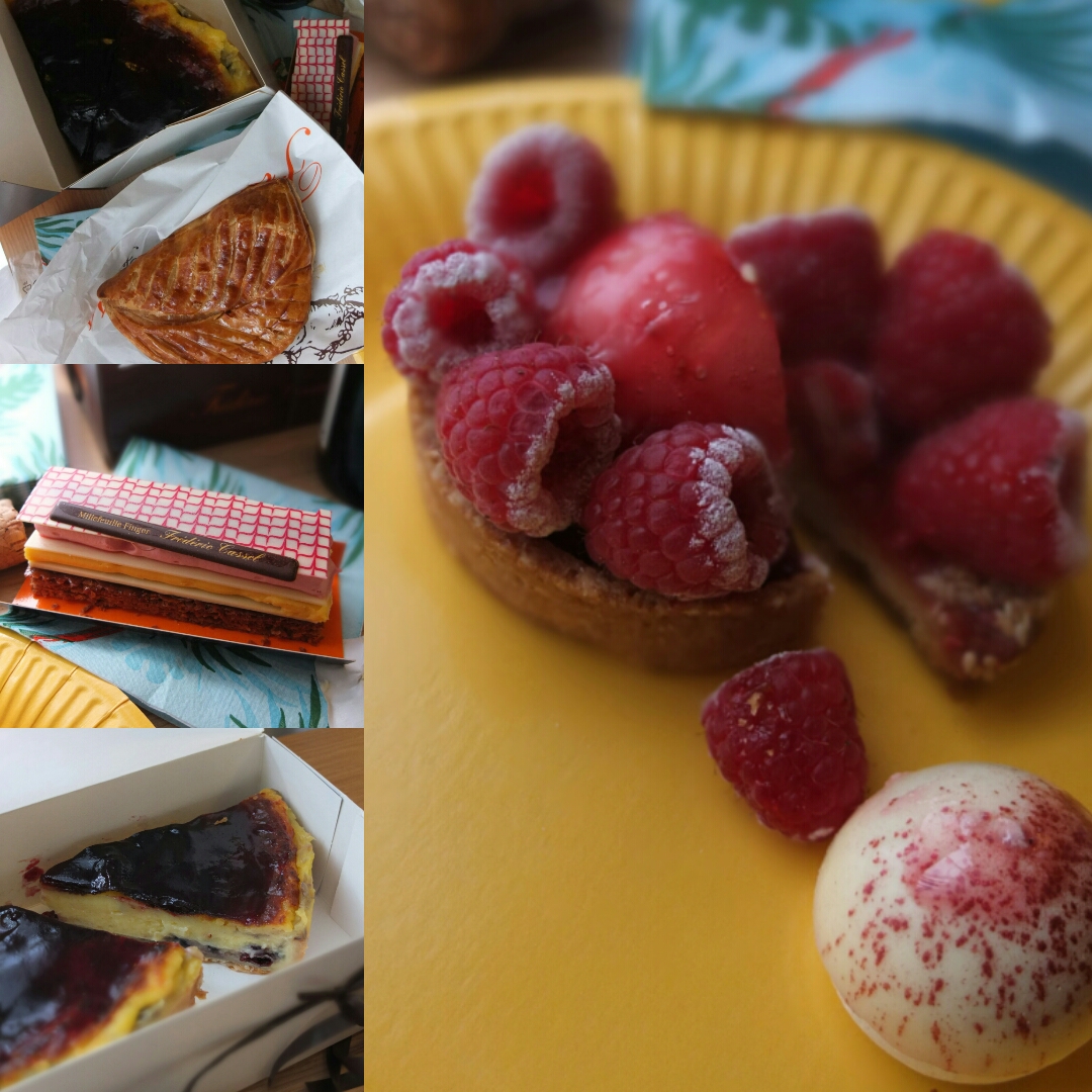 Notice my beloved slice of flan de cassis (blackcurrant flan) that kept me going.  Flans are delicious and creamy yet solid enough to take on trips! 🙂  Found all over France, they originated in Paris.  One day I’m going to make it.  This one’s from Frederic Cassel, one of our favourite pâtisseries and a major reason for our stay in Fontainebleau.  Call us crazy but look!