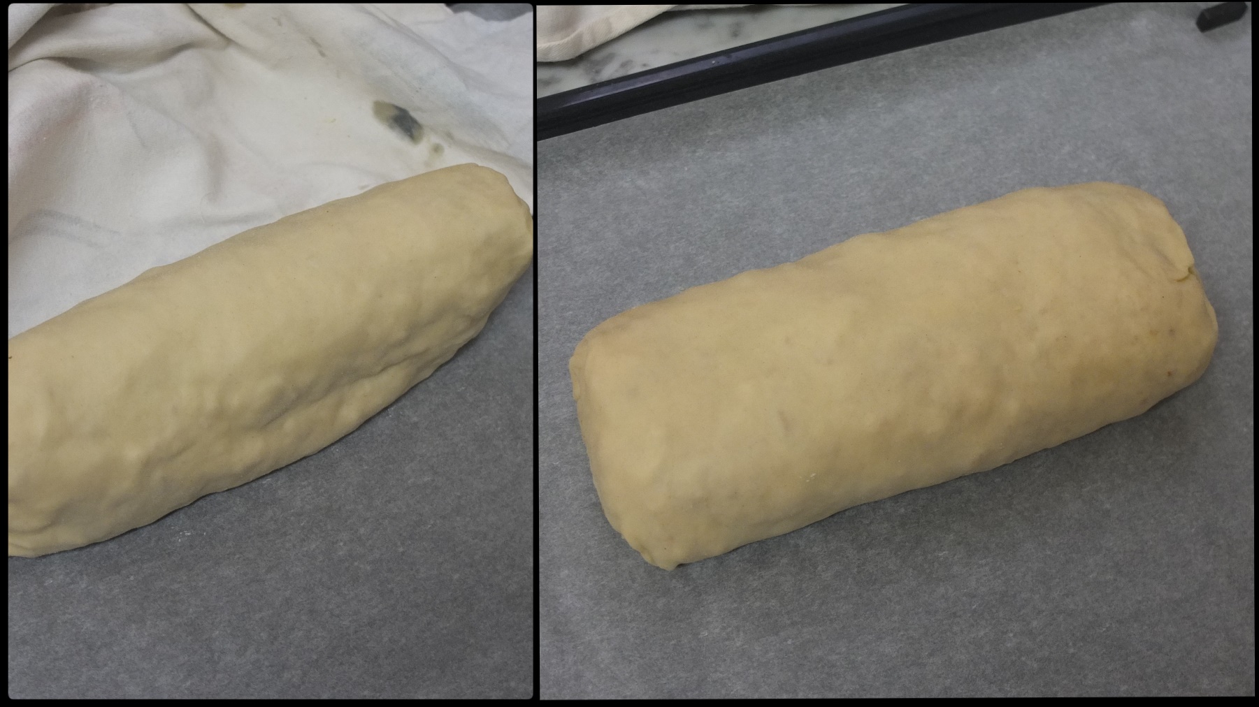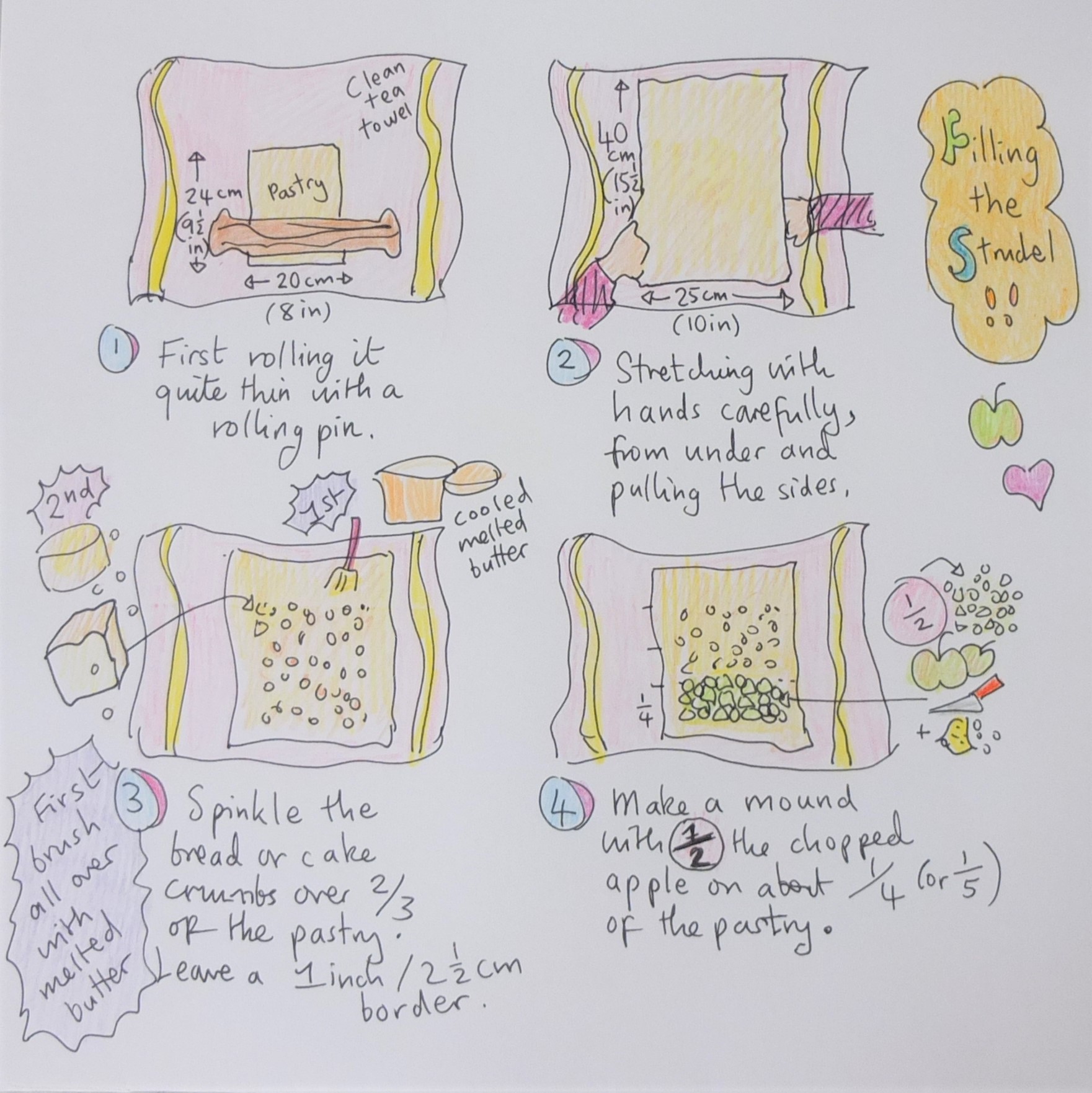 Before starting you could watch a funny little youtube video:  Strudel – watch a pro stretch dough. It shows the technique for hand stretching dough with some great tips, though you need practice to get as good as that little lady.  Amazing.  Anyway we’ll be fine starting with this smaller rectangle.  By strudel prototype number 5 it was getting easier and neater but even number 1 held together.  Sadly the first lower-gluten one semi-collapsed on the way to the baking tray and was patched up with extra traditional pastry!  Poor thing… but could still eat it!  Be careful but it’s all good and edible. 🙂  With the now improved lower-gluten pastry you can safely follow the steps below but your rectangle will be a bit smaller and thicker (have less rolls to avoid undercooked pastry layers).