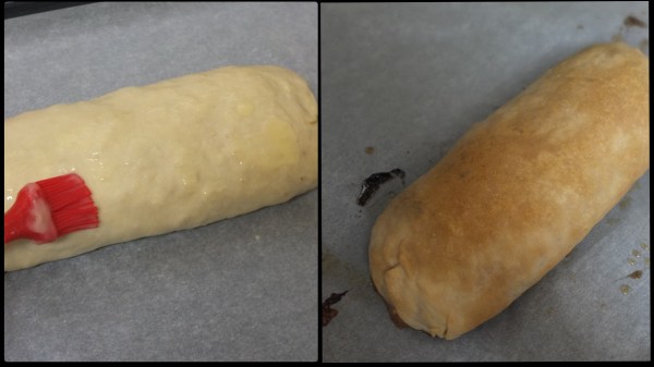 Roll it so the seam is under the strudel.  Brush with more melted butter and bake 15 minutes.  Then lower the oven temperature to 160°C/320°F (fan-assisted/convection) or 180°C/350°F (static, non-convection oven) and bake a further 15 minutes.  If it’s still a bit pale (you can brush again with more butter here if you like) bake a further 5 to 10 minutes until the strudel’s light golden brown.
