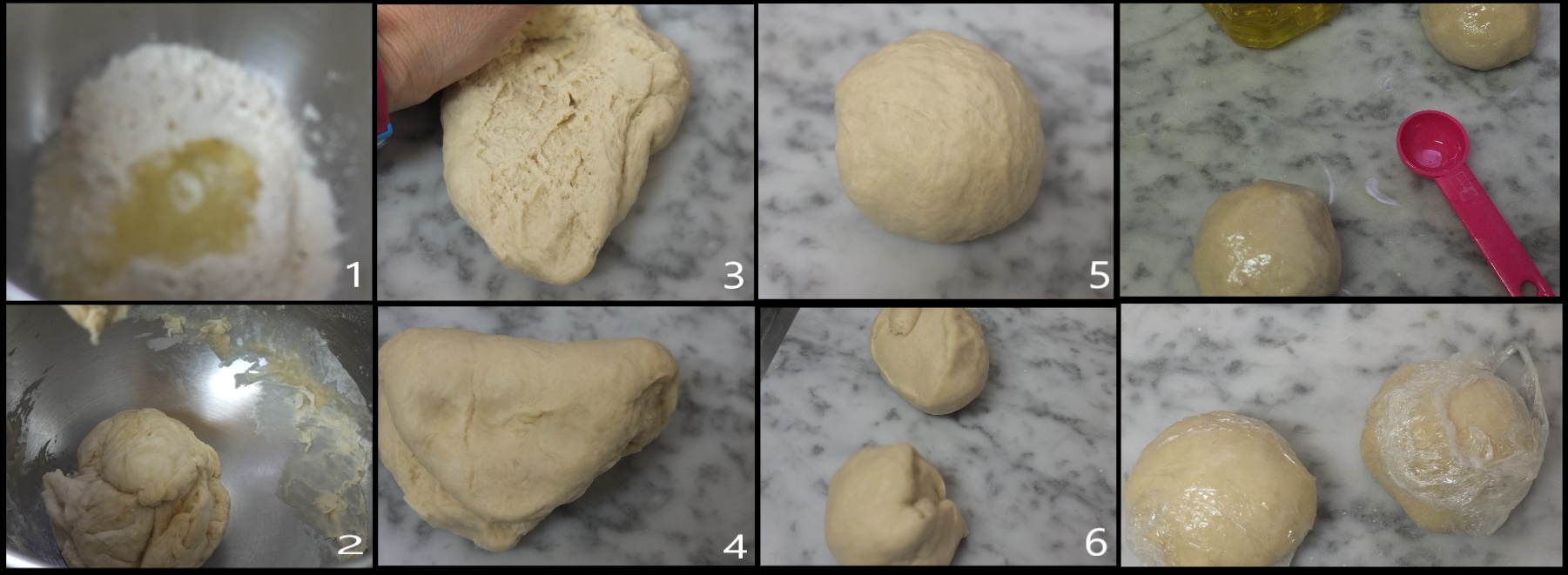 3. (b) stir in the bowl until the dough starts coming together, empty contents out onto the table and knead by hand about 5 or 10 minutes until the dough is smooth and comes off the table easily.  NOTE:  I’ve used methods (a) and (b) and they both work fine.  But be careful not to overknead.  The dough should be a little elastic but still soft – if it becomes too stiff it’s difficult to stretch.
