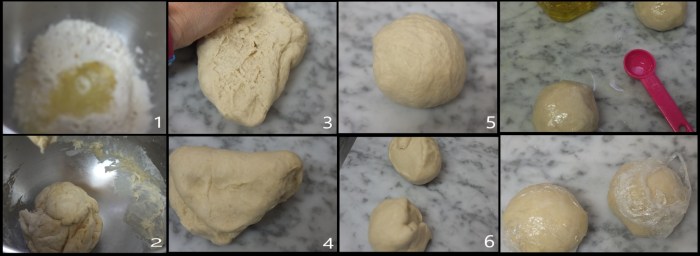 1. Whisk your flour and salt in a large bowl to combine.  Whisk the water and 24g of oil together in a small bowl.  Make a well in the flour and pour in the water and oil.
