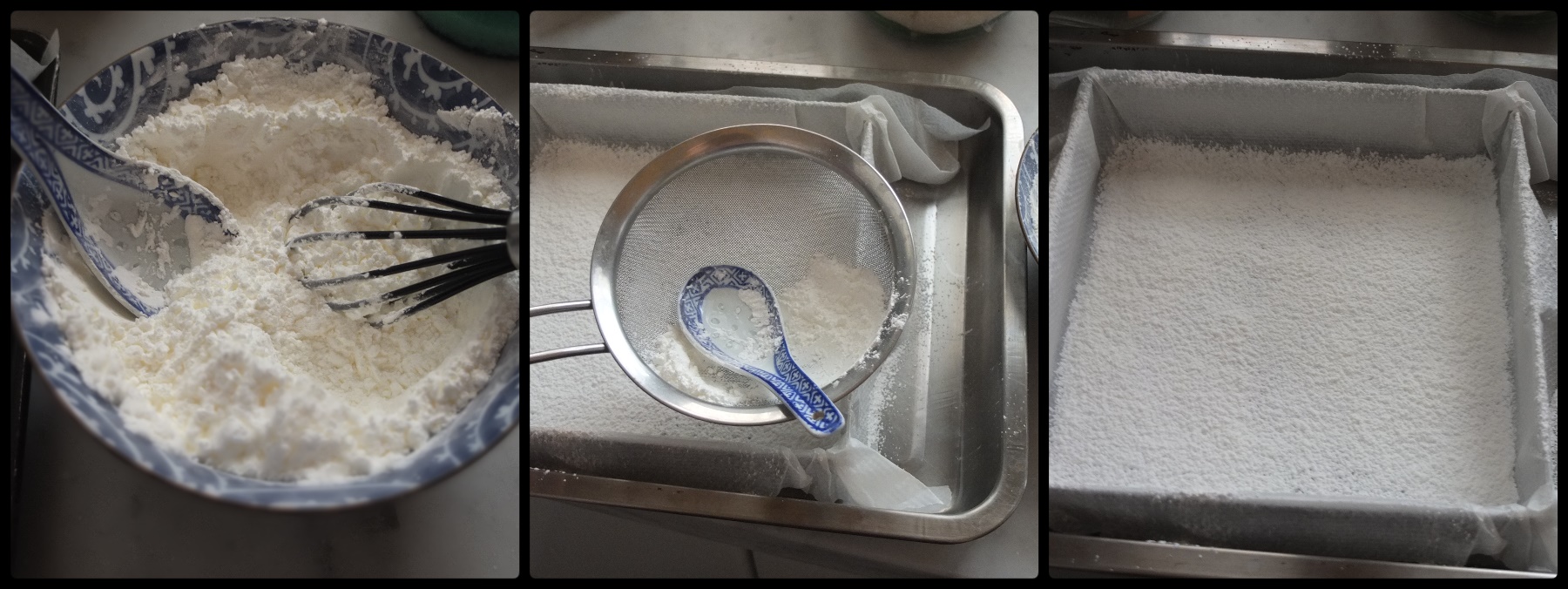 - Line your frame or tin with the baking paper and sieve to cover with a good layer of sugar/cornflour mixture (reserve a little more than half for later).