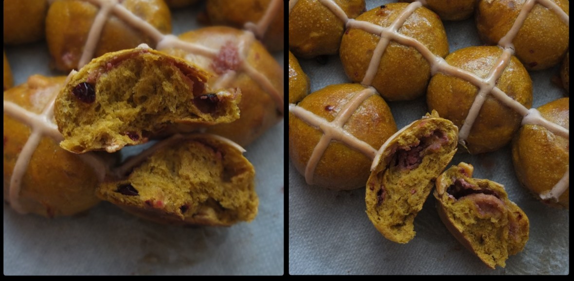 Ruby pumpkin and orange sourdough hot cross buns