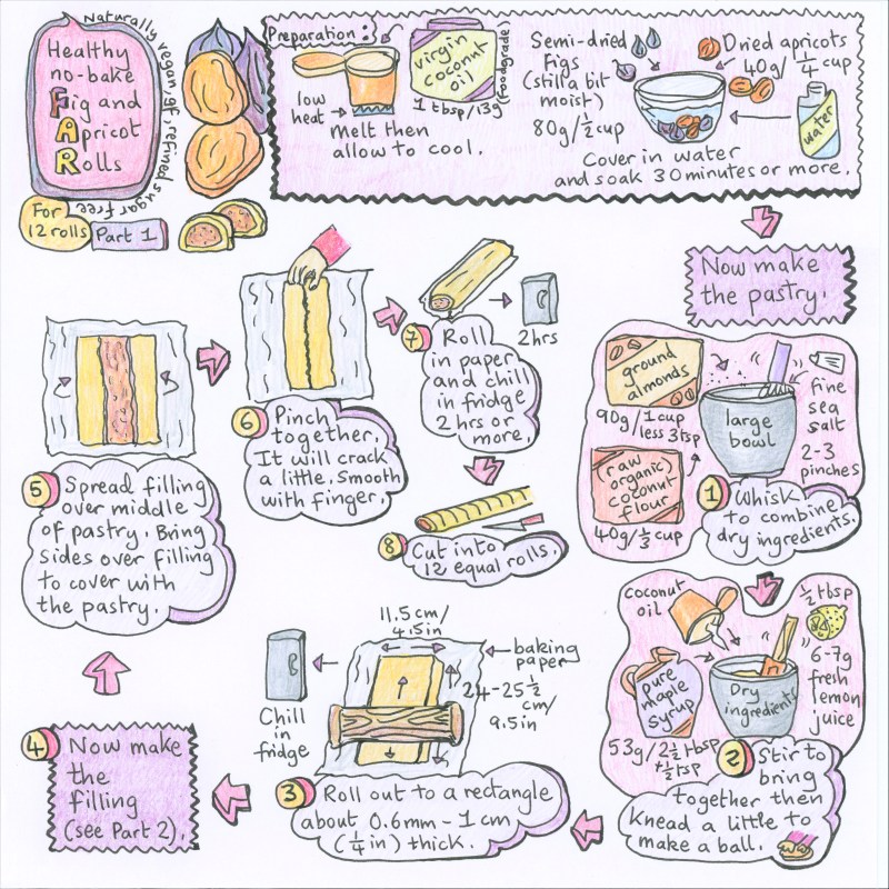These fig and apricot rolls have it all! They’re so yummy, healthy and easy to make! The filling is semi-dried moist figs and dried apricots blended with a little water, pure maple syrup and lemon juice. It’s deliciously moist and lightly spiced with ground ginger, cinnamon and cumin which lift and subtly complement the fruit without overwhelming it. The pastry’s similar to almond paste with ground almonds and pure maple syrup but there’s also a little coconut oil and lemon juice plus the raw organic coconut flour makes it taste more like cookie dough or cake bringing it to another level of yumminess and perfect texture. These rolls are effortlessly vegan, glutenfree and refined sugarfree with the apricot and lemon making them not too sweet! They contain great ingredients for your digestive system and you only need one or two as a satisfying dessert that makes you feel good! Which is perfect as they keep a month in the fridge. Hope you’ll try these raw fig and apricot rolls! Great for perfectly balancing yumminess and health! 😉