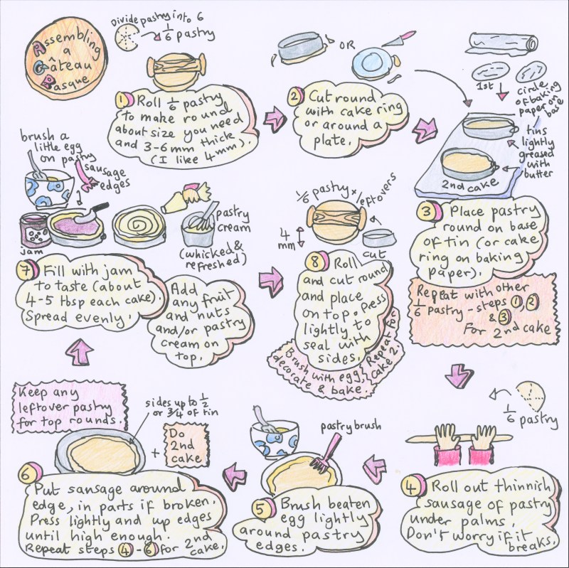 It’s a simple cake to make. The most difficult part is rolling out the soft dough. I still remember the chaos and disasters this caused us all on our Intensive basic Cordon Bleu course during a hot Parisian summer. There was a lot of sticky despair, re-rolling and throwing of extra flour on the work surface. But it’s actually a straightforward process following these tips: