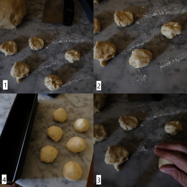 Roll lightly under your palm or for bigger and stickier balls use your metal pastry scraper to pull towards you and around. You should get well-structured balls that keep their shape and have formed a light outer skin. When you poke lightly with a finger the skin springs back a little. This will help your buns rise well and means the structure is good. NOTE: If you’re having a lot of trouble shaping and getting a good structure then place balls in baking tins lined with paper or lightly greased with butter. Tins help brioche rise and be even fluffier.