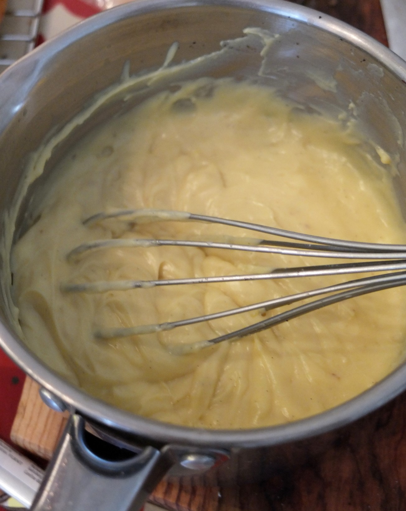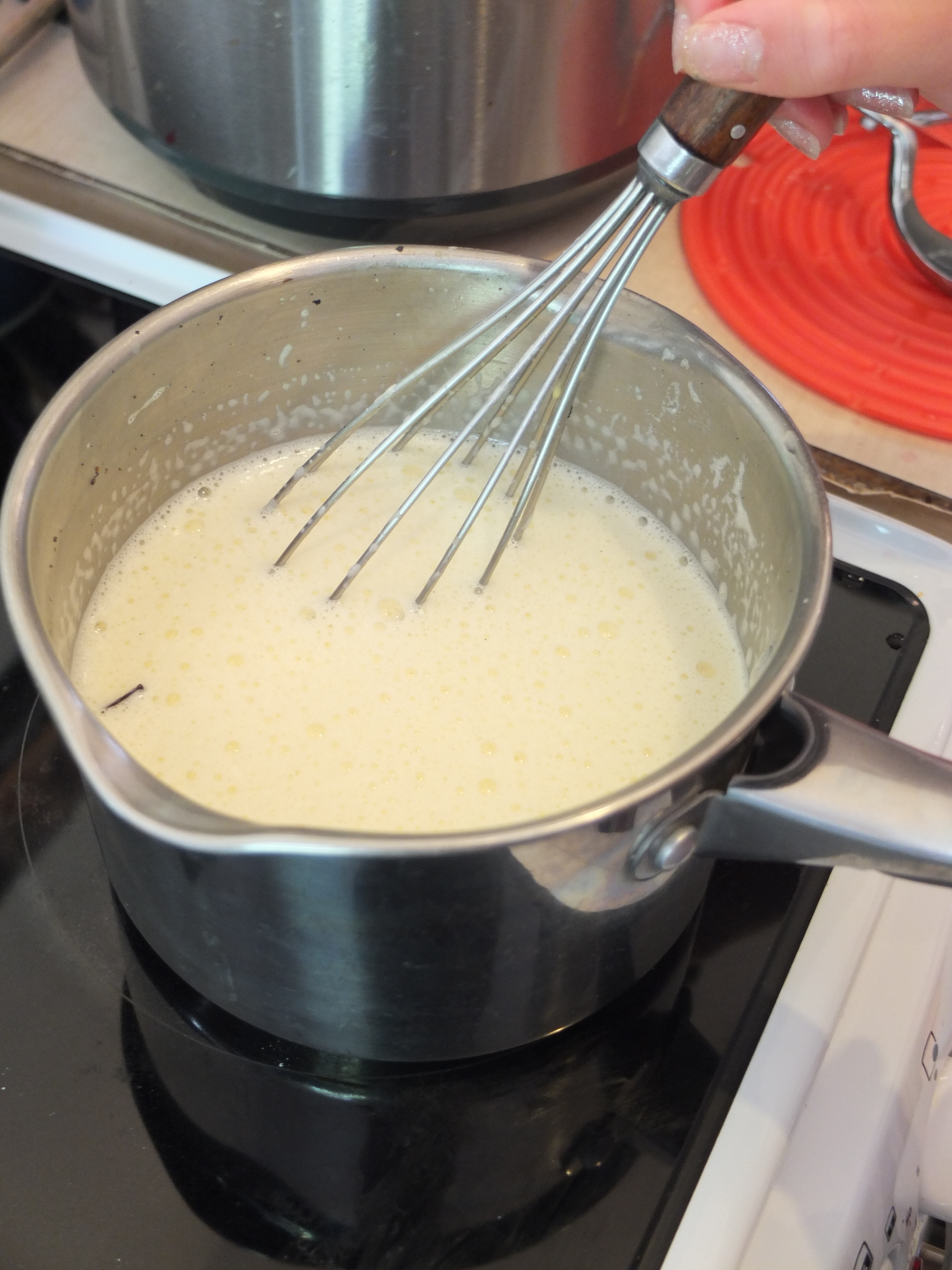 - As soon as it thickens take off heat, keep whisking and check the consistency. Too liquid and it’ll be like a loose cream on the run, too thick and it’ll be a tad gungy. Try to get it to that lovely creamy consistency that will hold but not be gooey. Return to the heat if it needs to thicken.