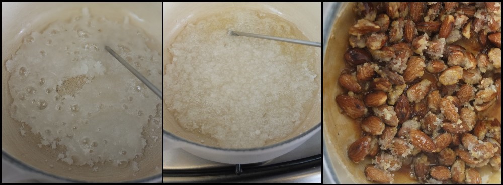 Boil the sugar and water till it reaches a temperature of 121°C/250°F. Use a sugar thermometre (I used a probe one) to check the temperature or do it by eye. The bubbles should be going very fast and it should be thickening (mine also seemed to be crystallising more than Bernard’s but it worked anyway). Add the almonds in one go and stir to coat the almonds in the syrup. The sugar will crystallise, going white and lumpy.