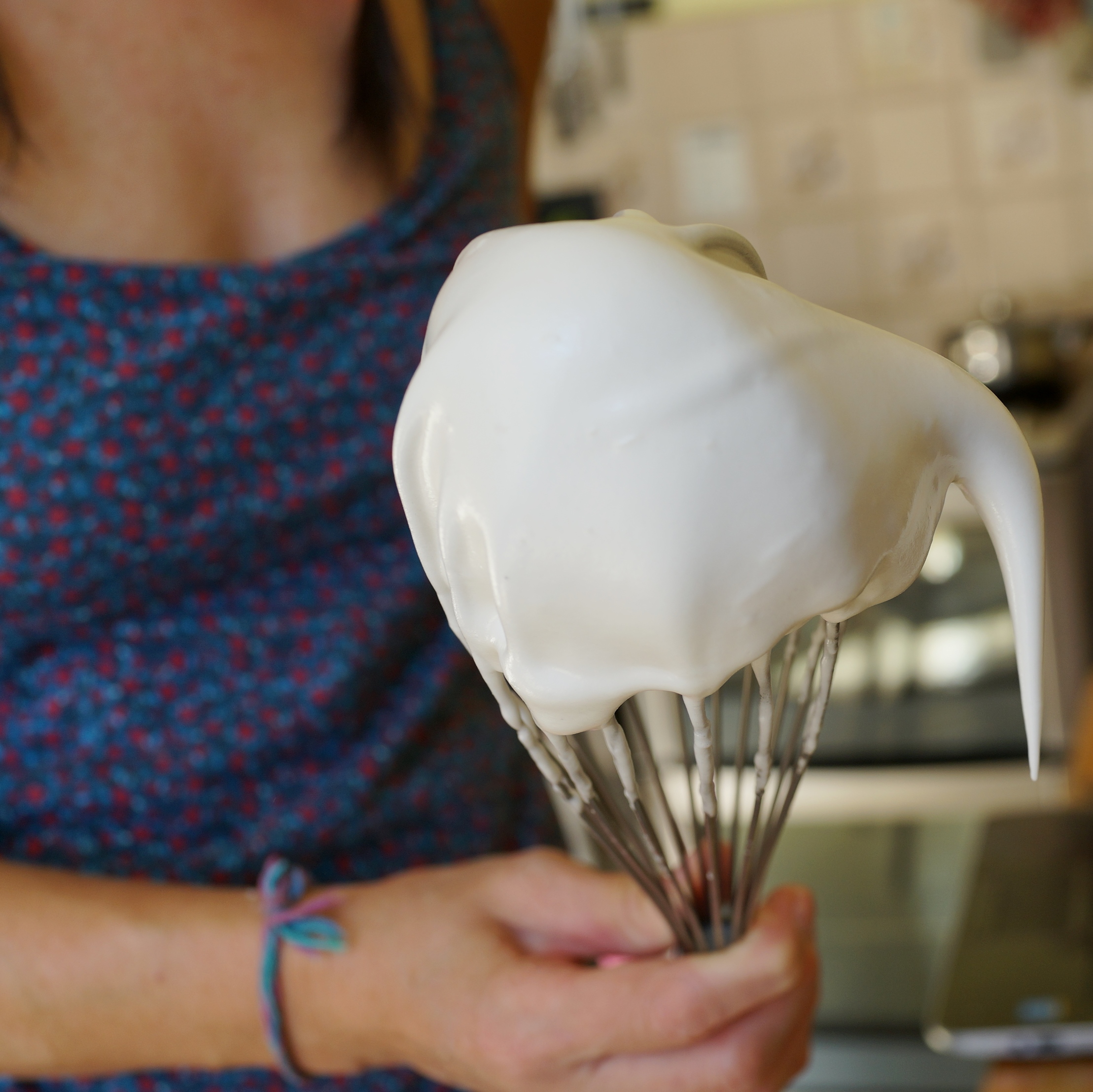 Soft peaks means the cream or egg whites have peaks with curls that go downwards (a ‘bec d’oiseau’ in French). It should still hold well and not slide down your whisk or out of an upside-down bowl. But it shouldn’t be dry like stiff peaks and it’s a more flexible and easier mixture to fold other ingredients into. To make sure you get soft peaks recipes often have you whisk in a little sugar, which will give you whites in a soft peak meringue as in the photo below.