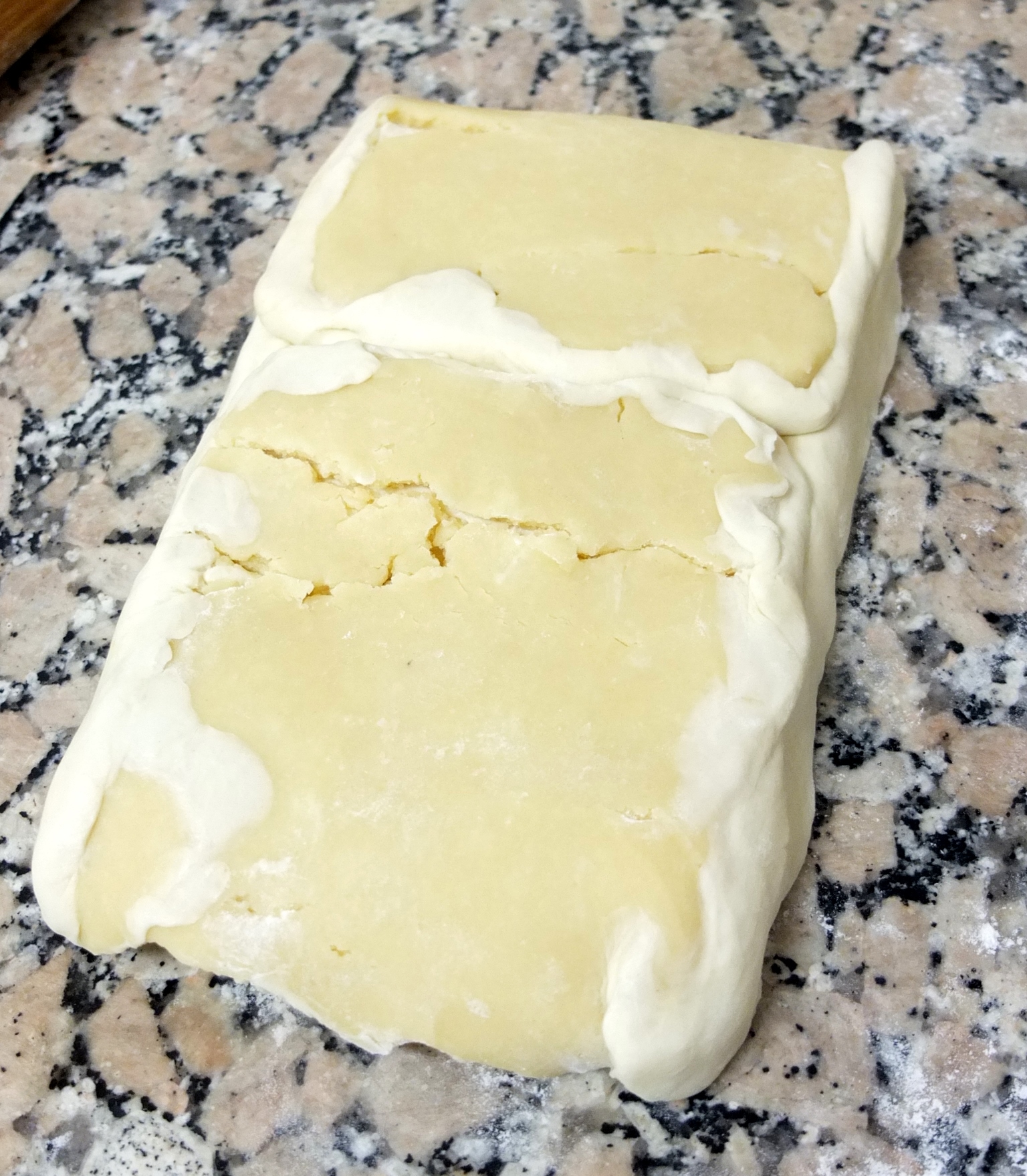 Here’s a disaster photo from one of my early attempts when I decided it didn’t matter if my détrempe was a bit soft and the butter quite hard. Oops. I won’t do that again!! Hopefully… 🙂 If it looks like this is going to happen to you, separate your layers before it’s too late and get them both to the right consistency!